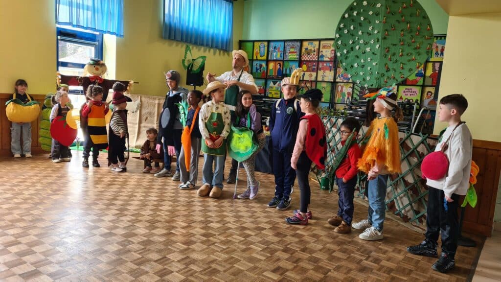 Mardi 6 mai 2025, tous les élèves de notre école ont participé au spectacle « un jardin à croquer » animé par Guillaume BOURGOUIN, de la compagnie « acteurs en herbe ». Parés de jolis costumes et accessoires de légumes, fruits ou encore petits animaux, les enfants se sont volontiers prêtés au jeu sur scène ! Un spectacle pédagogique coloré, vivant et rythmé par des chansons et des danses où ils ont pu enrichir leurs connaissances autour du jardin.